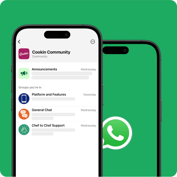 Join chefs in the Cookin WhatsApp group for real-time support, tips, and inspiration.