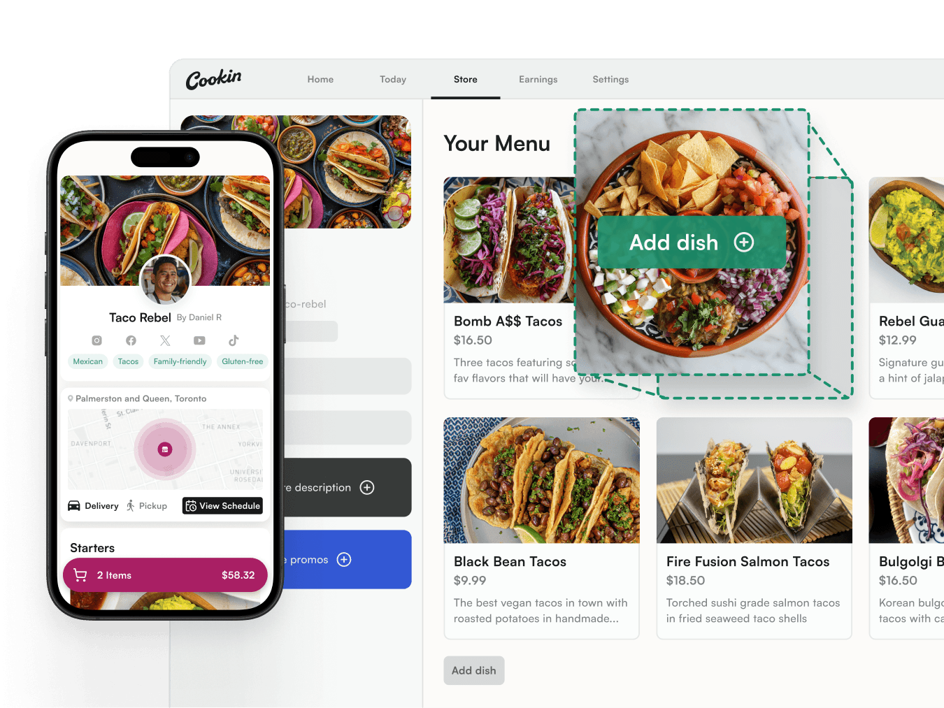With Cookin, you can offer delivery, pick-up, or both. Your storefront seamlessly integrates with third-party drivers—once you mark an order as "ready for pick-up," a driver will collect and deliver it. You and your customer get tracking info, so you can focus on cooking!